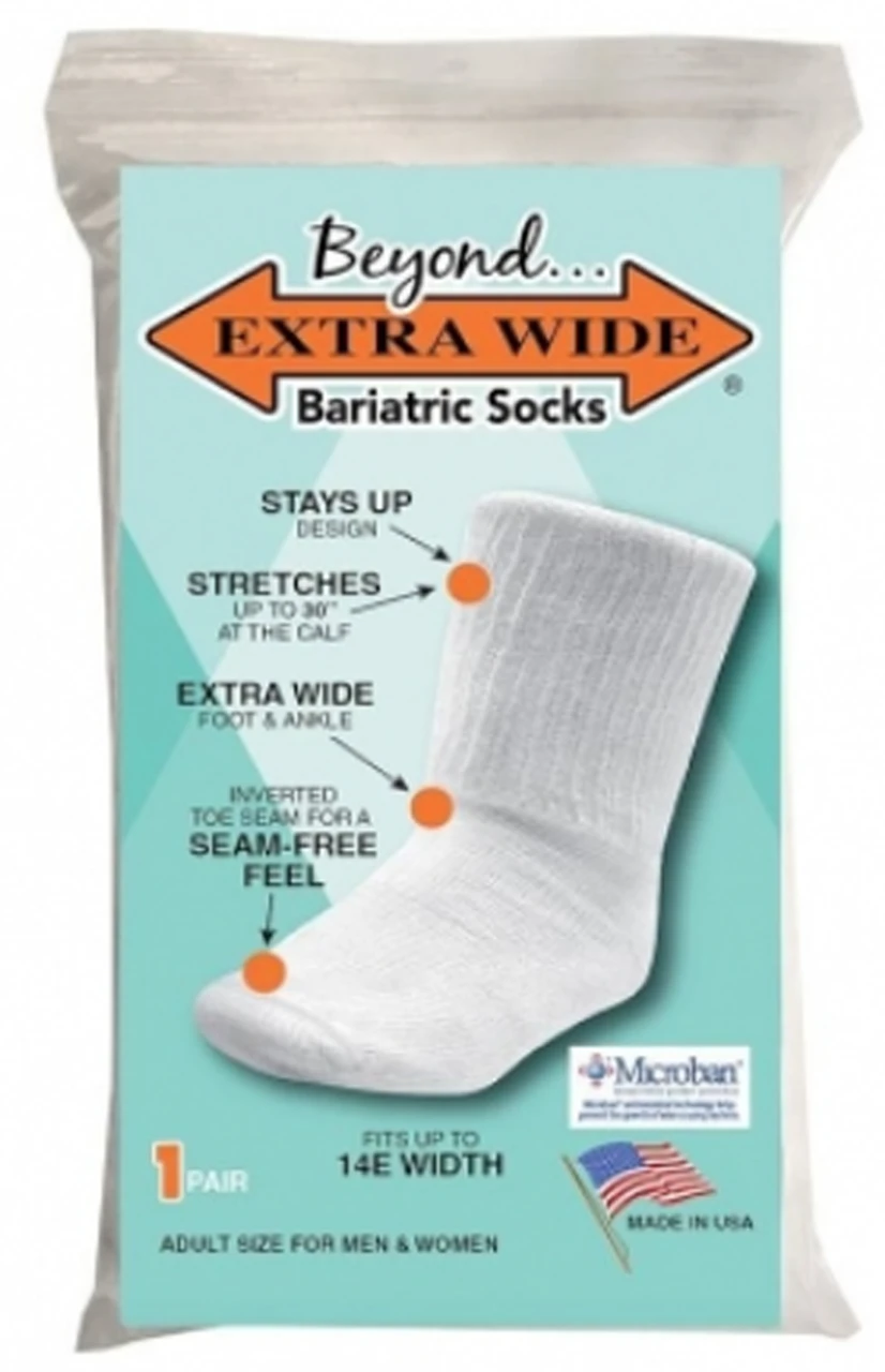 Designed for Men and Women with any condition where feet, ankles and calves are wide or swollen. Made in the USA, Beyond Extra Wide Bariatric Socks are like no other sock on the market. Designed to stay up, the calf stretches up to 30” and foot to 21″ and 14E width, making them the widest bariatric socks available. Microban Antimicrobial Technology Helps Prevent the Growth of Odor Causing Bacteria. Inverted Toe Seam is designed to be worn on the outside for people with diabetes. Available in Black or White.