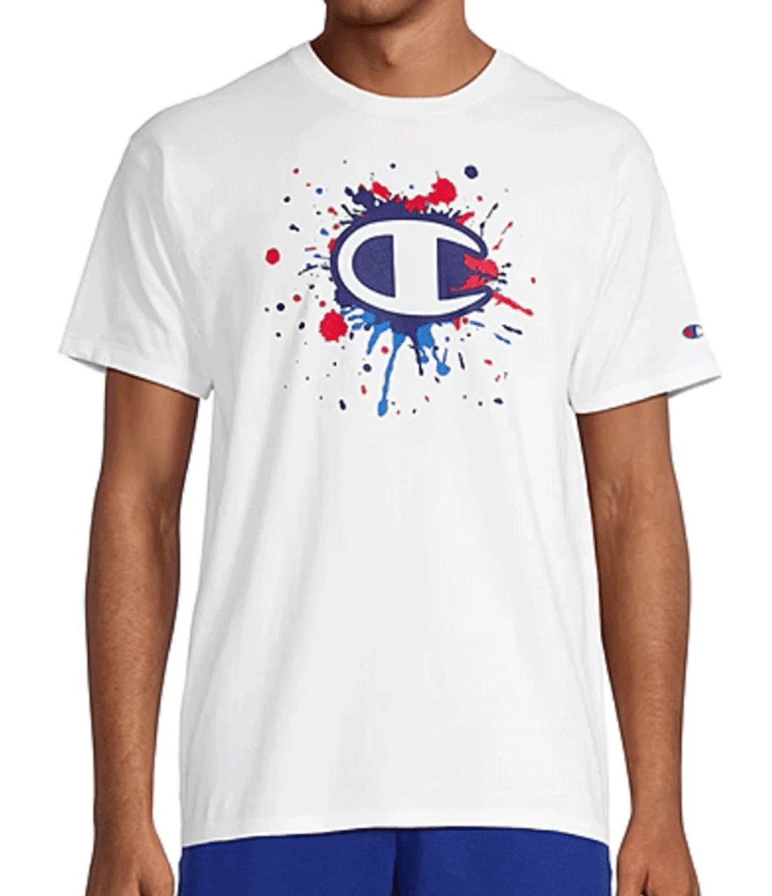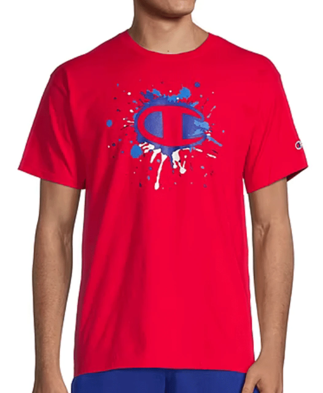 This Americana tee by Champion is the perfect addition to your casual wardrobe. It features a cool red, white and blue “paint splatter” pattern on the front of a quality, 100% soft cotton tee. Champion “C” logo patch embroidered on left sleeve. Fabric content: 100% cotton.
