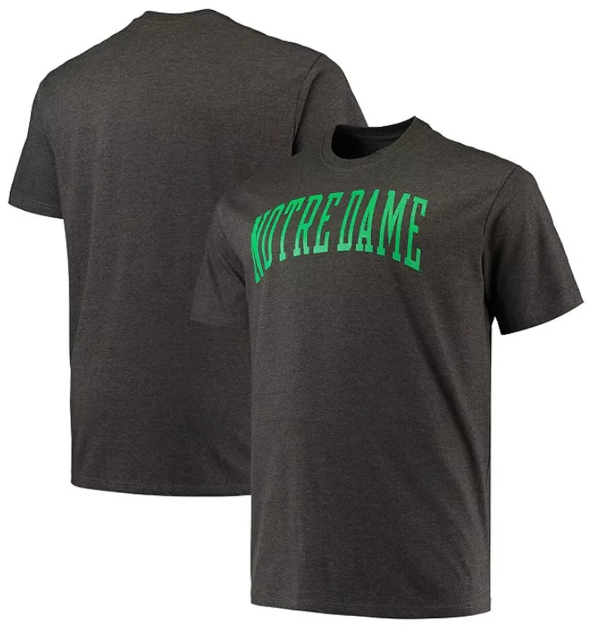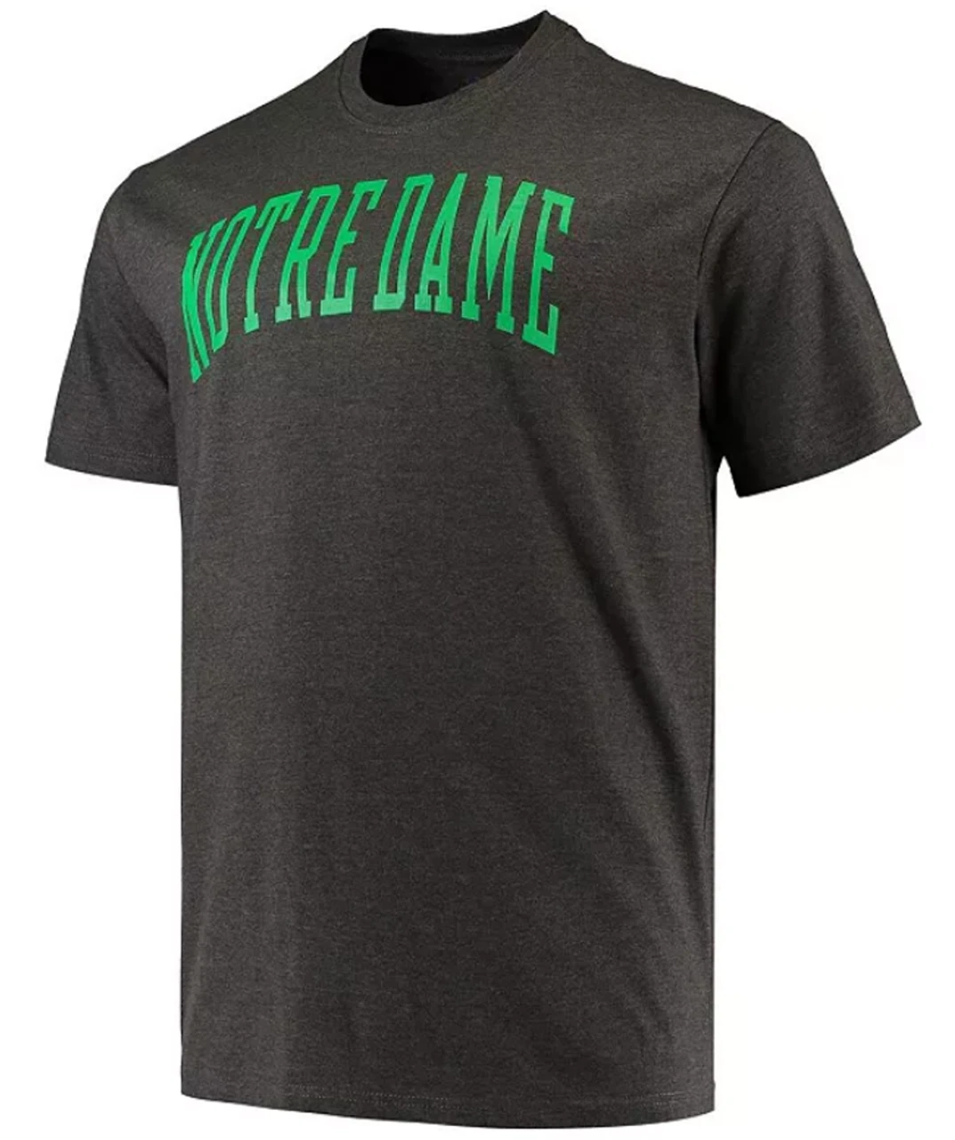 This classic Notre Dame arch tee shirt is a Fighting Irish fan’s must-have! It features Notre Dame arch graphics screen printed in green on the front of an extra soft, heavyweight heather charcoal tee. Ribbed knit collar, embroidered Champion “C” logo on left sleeve. Fabric content: 60% Cotton, 40% Polyester.