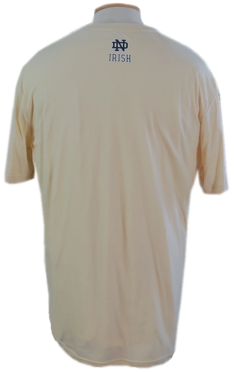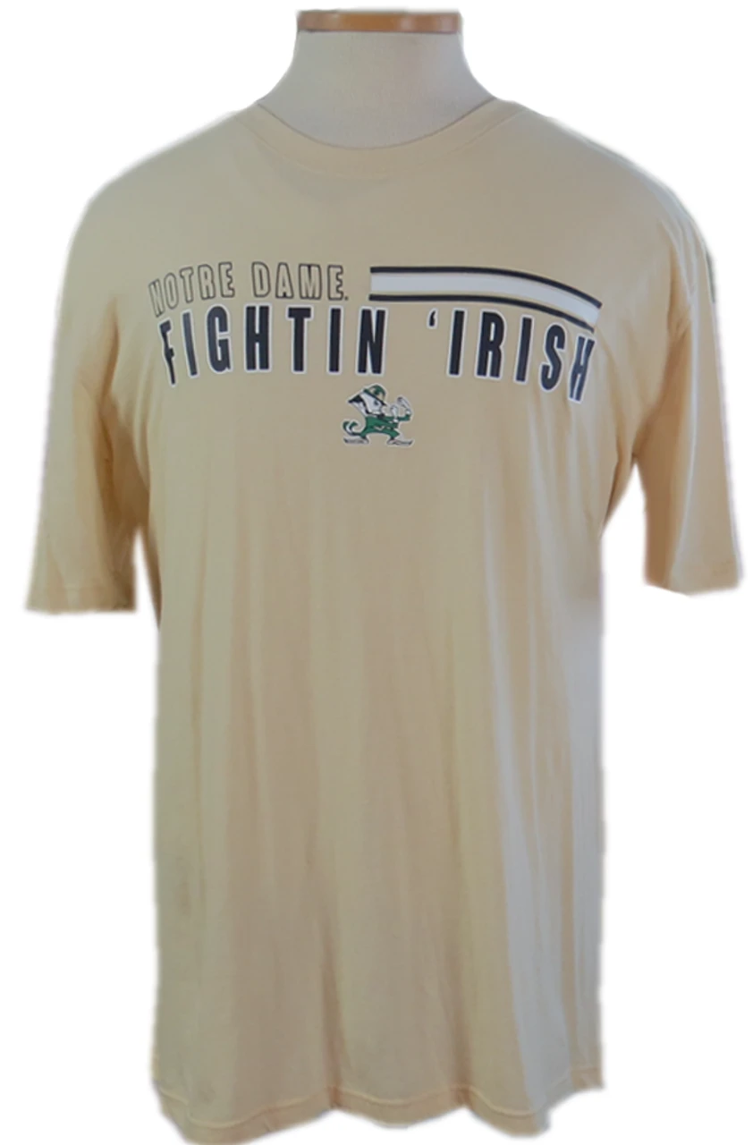 Show your love for the Fighting Irish in this 2020 Notre Dame tee by Colosseum. Lightweight and breathable. this tee is crafted from a blend of cotton and polyester, for a comfortable feel and long lasting wear. Features Rubberized Notre Dame graphics and logo on the front and back of the tee with contrasting navy blue taping at the neck. Relaxed fit and tagless design for extra comfort. Fabric content 60% Cotton, 40% Polyester.