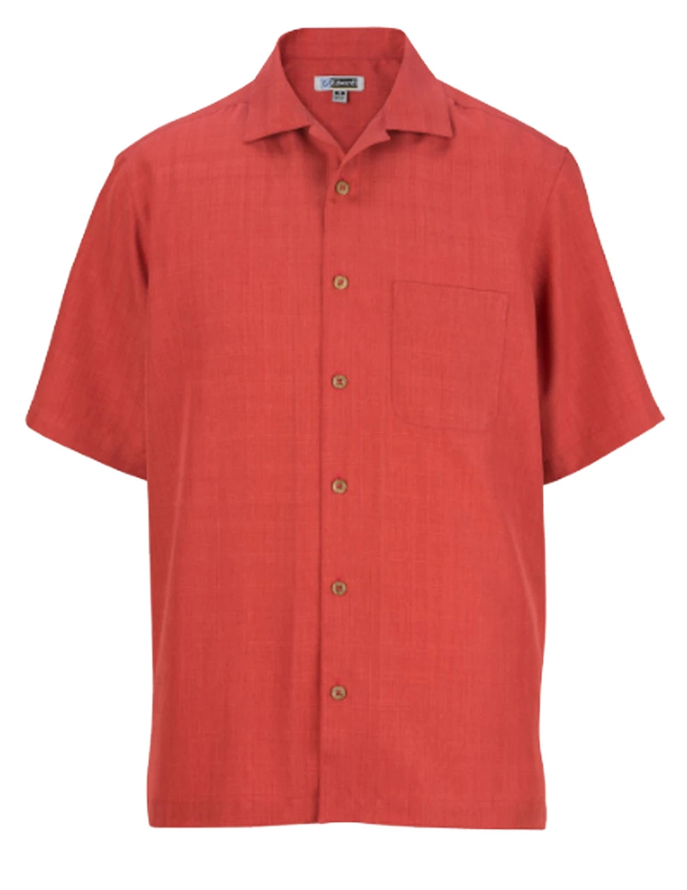 Enjoy the warm breeze with this contemporary weave camp shirt by Edwards.  Jacquard tone on tone pattern accents this soft and supple Batiste fabric. Features a classic camp style with open neck and notched collar. Natural buttons on placket, straight back yoke seam, full cut with left chest pocket and side vents at hem. Moisture wicking fabric helps keep you dry and comfortable, and is wrinkle resistant with soil release for easy care. 100% Polyester.