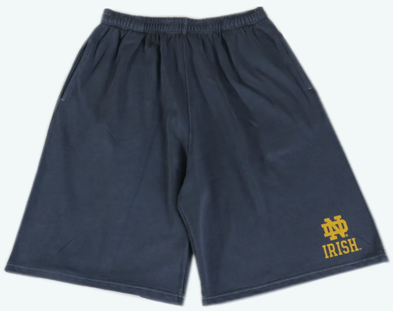 These Notre Dame shorts by Fanatics are perfect for hitting the gym, playing sports or relaxing. They feature the Notre Dame logo screen printed in gold on the left thigh. Two on-seam side pockets. Made of comfortable mid-weight fleece that has been pigment dyed to give a vintage broken-in look. Officially licensed NCAA apparel. Fabric content: 80% Cotton, 20% Polyester.