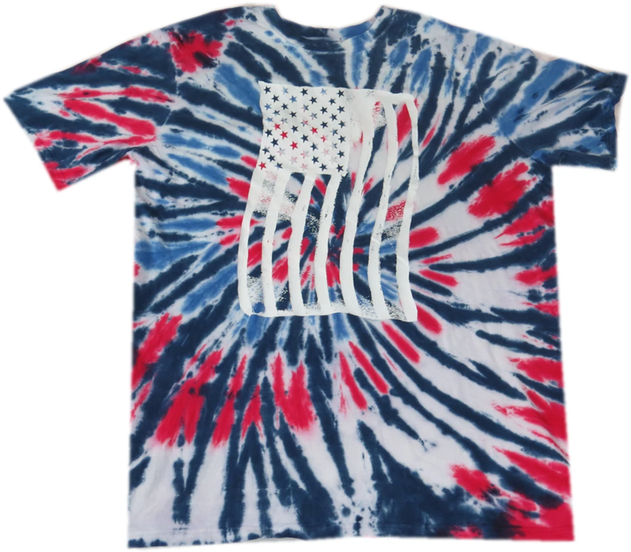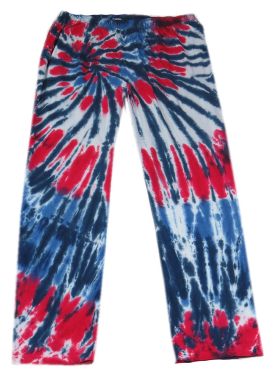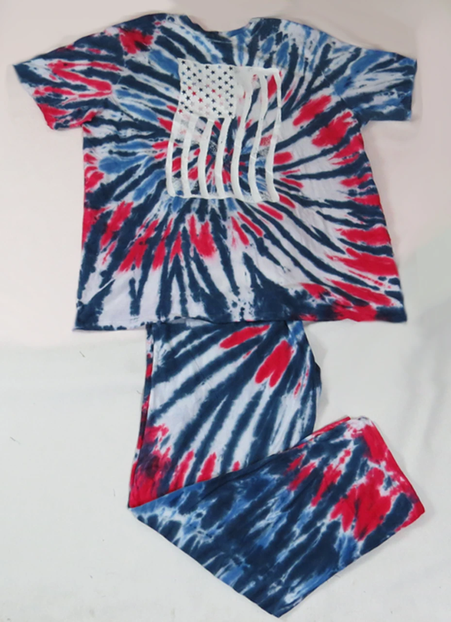 Feeling Groovy? This 2 piece lounge set by King Size is the perfect way to kick back and relax. It features a patriotic red, white and blue tie-dye pattern with screen printed American flag graphic on the front of the short sleeve tee shirt. Full elastic waist pants with two side pockets. Made of mid-weight soft jersey 100% cotton jersey material.