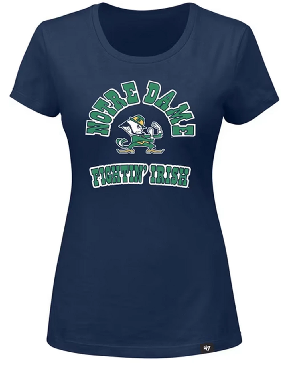 Ladies, show off your Fighting Irish pride in this navy blue Notre Dame tee shirt. It features screen printed Notre Dame, Leprechaun and “Fightin’ Irish” graphics on the front. Straight hem, ribbed knit collar and below-the-hip length. Printed on an extra soft, lightweight, 100% Cotton Tee shirt. Officially licensed NCAA Apparel.