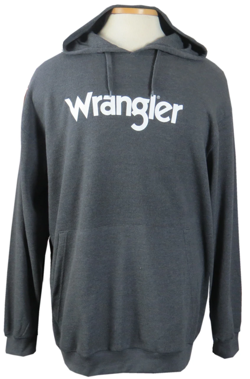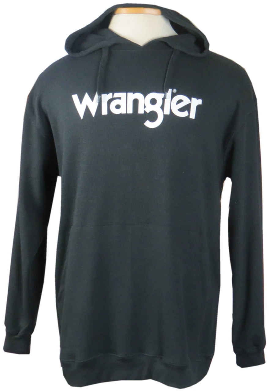 These pullover hooded thermal shirts by Wrangler are ideal for chilly weather. Made of lightweight waffle weave fabric for excellent insulation and breathability without the extra bulk. They feature the classic Wrangler logo screen printed on the front, adjustable hood with drawstring, and large kangaroo style front pocket. Pair with your favorite jeans on a laid-back fall day, or layer it for working or playing outdoors in colder weather. Fabric content: 60% Cotton, 40% Polyester.